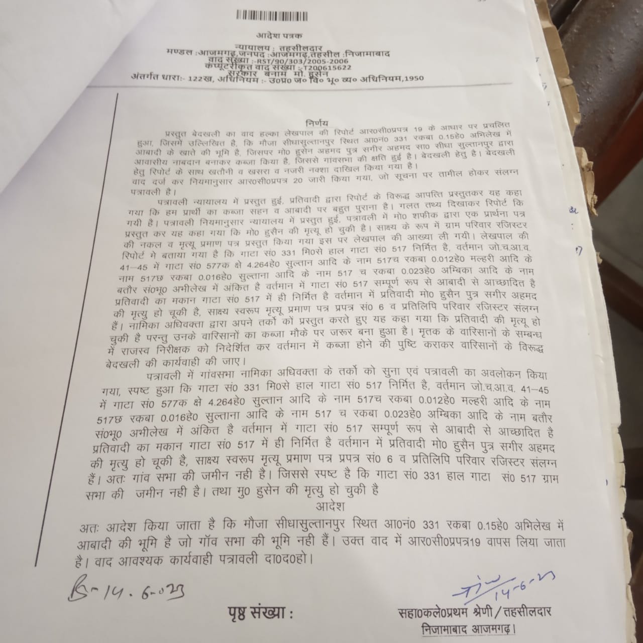 اعظم گڑھ 8 جون (نامہ نگار): ضلع اعظم گڑھ کی تحصیل نظام آباد میں 18 سال سے زیر التوا ایک کیس میں فیصلہ سنایا گیا ہے۔جو کہ علاقہ میں موضوع بحث بن گیا ہے۔ دراصل تحصیل نظام آباد کے گاؤں سیدھا سلطان پور کے رہنے والے مرحوم محمد حسین پر گاؤں کے ہی علاؤالدین وغیرہ نے لیکھ پال کی مدد سے فرضی رپورٹ بنا کر 115C کا مقدمہ درج کرا دیا، یہ فرضی مقدمہ محمد حسین کی موت کے بعد بھی چلا۔متاثرہ محمد حسین کے بیٹے ڈاکٹر خالد وغیرہ کا کہنا ہے کہ 115 سی بغیر کسی وجہ کے 18 سال سے ہم پر چلایا گیا۔کیونکہ آبادی کی زمین پر 115 سی مقدمہ نہیں چل سکتا۔جبکہ آبادی نمبر 331 حال گاٹا نمبر 517 آبادی کیٹیگری 6-2 کی زمین ہے۔ لیکن ایک آبادی کی زمین پر 18 سال تک 115C چلا کر ہمیں مالی اور ذہنی طور پر بہت تکلیف دی گئی۔ موجودہ لیکھ پال لال بہاری نے تحصیل دار کو پیش کی گئی اپنی رپورٹ میں واضح طور پر لکھا ہے کہ مدعا علیہ مرحوم محمد حسین کا گھر گاٹا نمبر 517 میں بنایا گیا ہے،جس پر فرضی طریقے سے 115 سی مقدمہ چلایا جا رہا تھا۔اس کے علاوہ مدعا علیہ محمد حسین کا انتقال 17 مارچ 2021 کو ہوا تھا۔اپنے حکم نامے میں تحصیلدار نے واضح طور پر لکھا ہے کہ سیدھا سلطان پور کی آبادی نمبر 331 ریکارڈ میں موضع براہ راست آبادی کی زمین ہے جو کہ گرام سماج کی زمین نہیں ہے۔مذکورہ معاملے میں آر سی فارم 19 واپس لے لیا جاتا ہے۔اس فیصلے کے بعد متاثرہ خاندان خوش ہے لیکن ان کا کہنا ہے کہ انہیں یہ انصاف ہمارے والد کی زندگی میں ہی ملنا چاہیے تھا۔ڈاکٹر خالد نے معزز عدالت بشمول اپنے وکیل ایڈووکیٹ شفیق، لیکھ پال لال بہاری، تحصیلدار رانی گریما جیسوال وغیرہ کا شکریہ ادا کیا کہ انہوں نے سچ کا ساتھ دیا۔ اس حکم نامے کو حق کی فتح اور علاؤالدین وغیرہ اور جھوٹ کی شکست قرار دیا۔یہ امر قابل ذکر ہے کہ مرحوم محمد حسین کے خلاف تیسری مرتبہ 115C کا مقدمہ درج کیا گیا تھا۔ پہلی مرتبہ درج 115C عدالت نے مسترد کر دیا، پھر ایک بار پھر فرضی طریقے سے متاثرہ پر 115 سی بنایا گیا، پھر متاثرہ کے محمد حسین نے اپنی کوششوں سے خارج کروا دیا۔ پھر 115 سی بنایا گیا، جسے اب محمد حسین کی موت کے بعد 2023 میں خارج کیا گیا۔