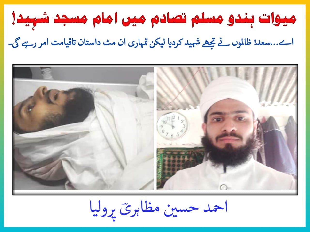 پرولیا 2/اگست(پریس ریلیز): احمد حسین مظاہری نے ایک بیان میں برہمی کا اظہار کرتے ہوئے کہا کہ آپ لوگوں کو از روئے یقین یہ خبر بذریعہ سوشل میڈیا معلوم ہوگئی ہوگی کہ سخت گیر ہندو تنظیم وشو ہندو پریشد اور بجرنگ دل نے پیر کو بھارت کے دارالحکومت دلی سے ملحقہ ریاست ہریانہ کے ضلع میوات کے علاقے نوح ضلع میں مذہبی جلوس نکالا تھا، اِسی جلوس کے اثناء دو گروپوں میں تصادم ہوا جس کی پاداش میں امام مسجد محمد سعد کو شہید کر دیا گیا؛ معتبر ذرائع کے مطابق محمد سعد مسجد میں نائب امام اور مؤذن تھے اور امام کی غیر موجودگی میں امامت کیا کرتے تھے۔۔
