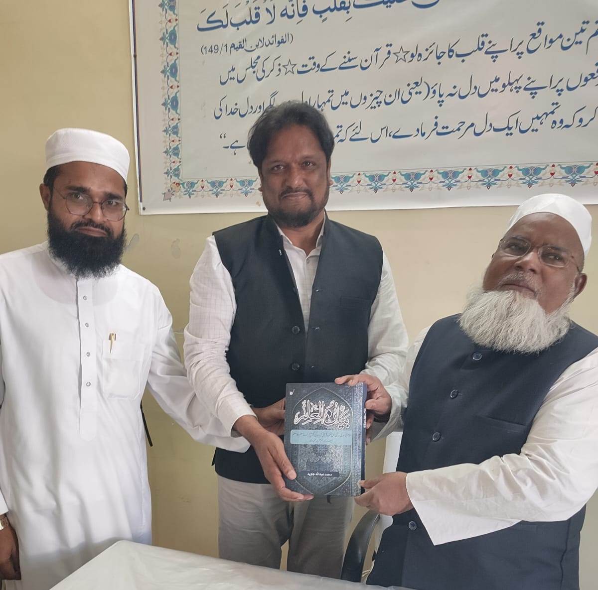 بیدر۔ 2؍جنوری (محمدیوسف رحیم بیدری): اساتذہ اور علم سے دلچسپی رکھنے والوں کے لئے بطور خاص تصنیف شدہ تازہ ترین تفسیر قرآن ’’بیان العلم ‘‘کے مصنف محمد عبد اللہ جاوید صاحب نے اس کا نسخہ مولانا خالد سیف اللہ رحمانی صاحب صدر آل انڈیا مسلم پرسنل لاء بورڈ وناظم المعہد العالی الاسلامی حیدرآباد کی خدمت میں پیش کیا جنہوں نے اس کتاب کا مقدمہ تحریر فرمایا ہے۔مولانا خالد سیف اللہ رحمانی صاحب نے عصری درسگاہوں کے اساتذہ کرام کو قرآن مجید سے وابستہ کرنے کی اس کو ایک کامیاب کوشش قرار دی اور فرمایا کہ علمی و فکری تیاری کے ساتھ اگر عصری درسگاہوں کے طلبہ کو تعلیم دینے والے اساتذہ کرام اور خاص طور سے وہ لوگ جو عوامی درس دیتے ہیں اس کی تعلیم کا اہتمام کریں تو لازماً ہماری ایسی نسلیں تیار ہوں گی جن سے ملک و ملت کی حقیقی خیر خواہی ممکن ہوسکے گی۔اس موقع پر المعہدالعالی الاسلامی حیدرآباد کے استاذ مولانا ارشد قاسمی صاحب اور محمد عرفان منیار صاحب موجود تھے۔بیان العلم میں علم و تعلیم سے متعلق منتخب قرآنی آیات کی تشریح، موجودہ تعلیمی تقاضوں کے پیش نظر، 45 تفاسیر کی روشنی میں کی گئی ہے۔ 506 صفحات پر مشتمل یہ کتاب وھائٹ ڈاٹ پبلشرز دہلی سے حاصل کی جاسکتی ہے. رابطہ کے لیے8447622919 اور whitedotpublishers.com پرفون یا وزٹ کریں ۔