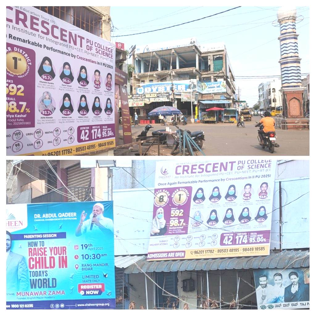 بیدر۔ 19؍اپریل (محمدیوسف رحیم بیدری): بسواکلیان کے کریسنٹ پی یوسائنس کالج نے پی یوسی سائنس سال دوم کے اپنے کالج کے شاندار جملہ نتائج 95.04%کو بیدر ضلع کی عوام تک پہنچانے کی کوشش کررہے ہیں تاکہ پتہ چل سکے کہ بیدر ضلع کے تعلقہ بسواکلیان کاایک مینارٹی کالج اپنے اندر شاندار نتائج رکھتاہے۔ اس کے لئے کریسنٹ پی یوسائنس کالج بسواکلیان کے اربا ب مجاز نے بسواکلیان، ہمناآباد ، بھالکی اور بیدر کے مختلف مقامات پر ہورڈنگ لگواکر اپنے یہاں پڑھنے والے طلبہ کے شاندارنتائج اور مجموعی نتیجہ بھی پیش کیاہے۔ کریسنٹ کالج کی حوریہ کشف نے 98.7%نشانات لے کر بیدر ضلع میں نمبرون پوزیشن حاصل کی ہے، اس طالبہ کی سبھی تعریف کررہے ہیں۔کریسنٹ کالج کے 42طلبہ امتیازی نشانات سے کامیاب ہوئے ہیں ۔ 174طلبہ کانتیجہ درجہ ء اول میں رہاہے۔ مضامین کے حوالے سے بھی طلبہ نے کافی عمدہ مظاہر کرتے ہوئے بیالوجی میں صدفیصد نشانات ، اُردو میں صدفیصدنشانات ، حساب میں 99، کیمسٹری میں 99، فزکس میں 99، کنڑامیں 98، انگریزی میں 97اور ہندی میں 96نشانات لے کر اپنی قابلیت کامظاہرہ کیاہے۔ حوریہ کشف کے علاوہ 10طلبہ (جن میں 8طالبات ہیں )،کے نشانات95.7%سے 90%تک بتلائے گئے ہیں۔ زائد تفصیلات کے لئے ضلع بیدر کے اولیائے طلبہ کریسنٹ کالج بسواکلیان کے رابطہ نمبرات 9620117782 / 8050395 / 9844918585 پررابطہ کرسکتے ہیں۔ مسرت کی بات یہ ہے کہ جن برقعہ پوش طالبات کے نتائج ہورڈنگ پر پیش کئے گئے ہیں، ان کے چہروں کو ماسک سے ڈھکاگیاہے تاکہ طالبات بے پردہ نہ ہوسکیں اور ان کی پرائیویسی برقرار رہے۔اور افسوس کی بات یہ ہے کہ بیدر شہرکے کسی بھی پی یو کالج نے اِمسال اپنے پاس کے طلبہ کے نتائج ہورڈنگ پر نہیں پیش کئے ہیں الا ماشاء اللہ۔اخبارات میں خبر البتہ دی گئی تھی۔