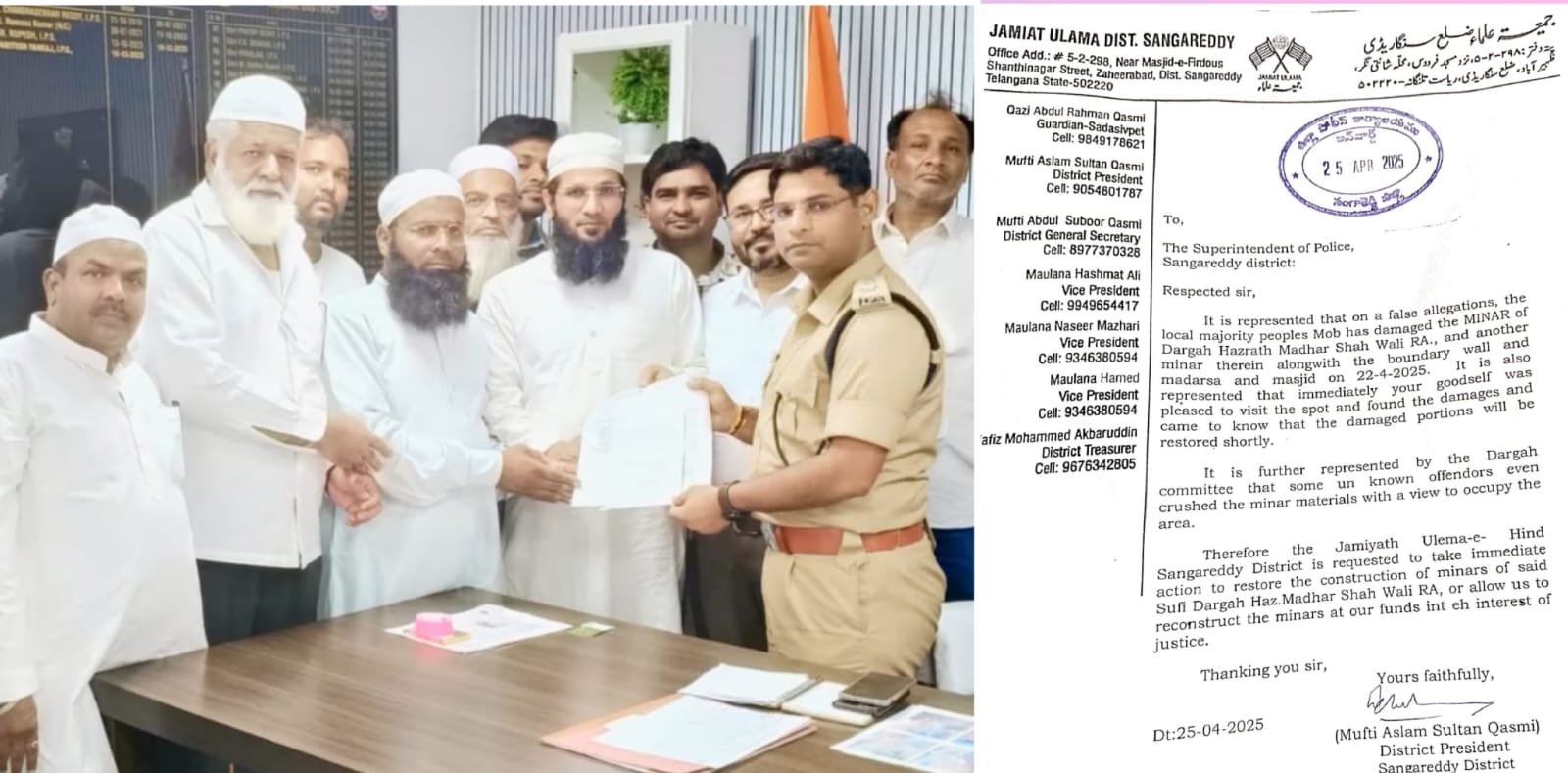 ظہیرآباد 26اپریل(مشرقی آوازجدید): ابھی چند روز قبل اسلام پور جنارم منڈل ضلع سنگاریڈی میں شرپسند عناصر نے درگاہ حضرت غریب شاہ ولی رحمت اللہ علیہ اور ان کے شاگرد وخلیفہ حضرت مدھار ولی شاہ ولی رحمت اللہ علیہ کے مزار شریف کو نقصان پہنچا یا اوراس کو شہید کردیا تھا۔ ریاستی صدر محترم حضرت مولانا حافظ پیر شبیر احمد صاحب مدظلہ صدر جمعیۃ علماء تلنگانہ کی ہدایت پر جمعیۃ علماء ضلع سنگاریڈی کے ذمہ داران نے ضلع ایس پی صاحب سے ملاقات کرکے ان کو میمورنڈم پیش کیا، ایس پی صاحب نے وفد کو تیقن دیا ہے کہ وہ جلد از جلد دونوں بزرگان دین کے مزار شریف کو از سر نو دوبارہ تعمیر کرائیں گے۔ اس موقع پر جمعیۃ علماء ضلع سنگاریڈی کے صدر مفتی اسلم سلطان صاحب قاسمی، جناب کلیانی ذکی الدین صاحب، امیر حمزہ منصور علی صاحب اس کے علاوہ کل جماعتی ذمہ داران بھی موجود تھے۔۔۔۔۔
