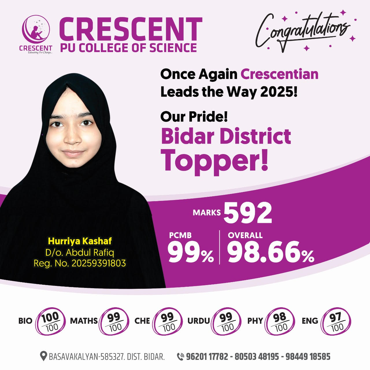 حوریہ کشف نے98.66%نشانات حاصل کئے، اردو میں 99نمبرات بیدر۔ 10؍اپریل (محمدیوسف رحیم بیدری): بسواکلیان کے کریسنٹ پی یو کالج آف سائنس کی ہونہار طالبہ حوریہ کشف نے پی یوسی سال…