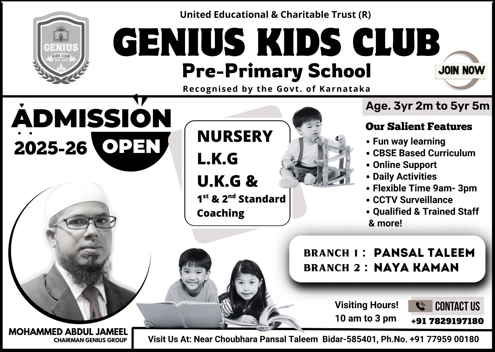 بیدر۔ 12؍مئی (محمدیوسف رحیم بیدری): یونائیٹڈ ایجوکیشنل اینڈ چیرٹیبل ٹرسٹ کے زیراہتمام چلائے جانے والے جینئس کڈس کلب (پری پرائمری اسکول ) میں تین سال سے زائد تا ساڑھے پانچ سال تک کے بچوں کے لئے نرسری ، ایل کے جی ، یوکے جی اور اول ودوم جماعت کی کوچنگ دی جائے گی ، داخلہ کے خواہشمندوالدین فوری طورپر توجہ دے سکتے ہیں۔ جناب محمد عبدالجمیل چیرمین جینئس گروپ کے مطابق پنسال تعلیم اور نئی کمان برانچ میں بچوں کو کھیل کھیل میں سمجھانے کااہتمام کیاجاتاہے۔ سی بی ایس ای بنیاد والے نصاب کوترجیح دی گئی ہے۔ آن لائن سپورٹ ہے۔ روزانہ سرگرمیاں صبح 9بجے سے دوپہر 3بجے تک ہوں گی۔جس کے لئے قابل اور تربیت یافتہ اسٹاف رکھاگیاہے۔ سی سی ٹی وی کے ذریعہ تمام سرگرمیوں پر نظر رکھی جاتی ہے۔ چوبارہ ، پنسال تعلیم بیدر برانچ پر ملاقات کی جاسکتی ہے۔ 7829197180 پررابطہ کرسکتے ہیں۔