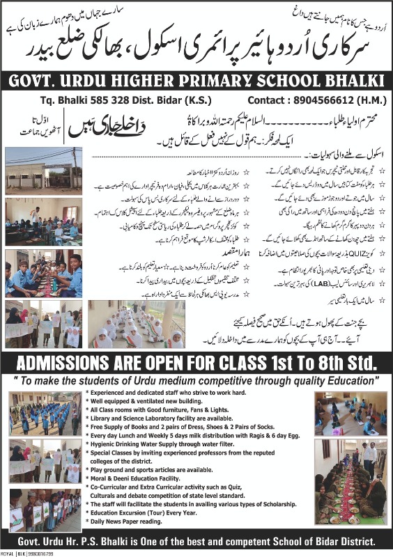 بیدر۔ 8؍جون(محمدیوسف رحیم بیدری): سرکاری اردو ہائیرپرائمری اسکول (اول تا ہشتم) بھالکی میں طلبہ وطالبات کے لئے داخلے جاری ہیں۔ یہ ایک سرکاری لیکن معیاری اسکول ہے یہاں پڑھنے والے طلبہ آج انجینئر ، سی اے ، ڈاکٹر ، اور لیکچرر بن چکے ہیں۔ حکومت کی جانب سے طلبہ وطالبات کو مفت کتابیں اور سال میں دومرتبہ یونیفارم دیاجاتاہے۔ جوتے اور دوجوڑی موزے دئے جاتے ہیں۔ ہفتہ میں پانچ دن دودھ اور راگی دی جاتی ہے۔ دوپہر کے گرم کھانے کانظم ہے۔ ہفتے میں چھ دن انڈے کھلائے جاتے ہیں۔ لائبریری اور سائنس لیب کی سہولت ہے۔ دینی تعلیم پر بھی خاص توجہ دی جاتی ہے۔ ہر کلاس میں بجلی ، پنکھا، اور فرنیچر ہے۔ ہر ماہ ضلع کے معروف پروفیسر یالیکچرر سے طلبہ کو خصوصی کلاس لی جاتی ہے۔ کوئز کلچر عام ہے۔ لہٰذا اولیائے طلبہ سے گزار ش ہے کہ وہ اپنے بچوں کا بھالکی کے سرکاری اردو ہائیرپرائمری اسکول میں داخلہ کرائیں۔رابطہ کے لئے 8904566612پر رابطہ کرسکتے ہیں۔