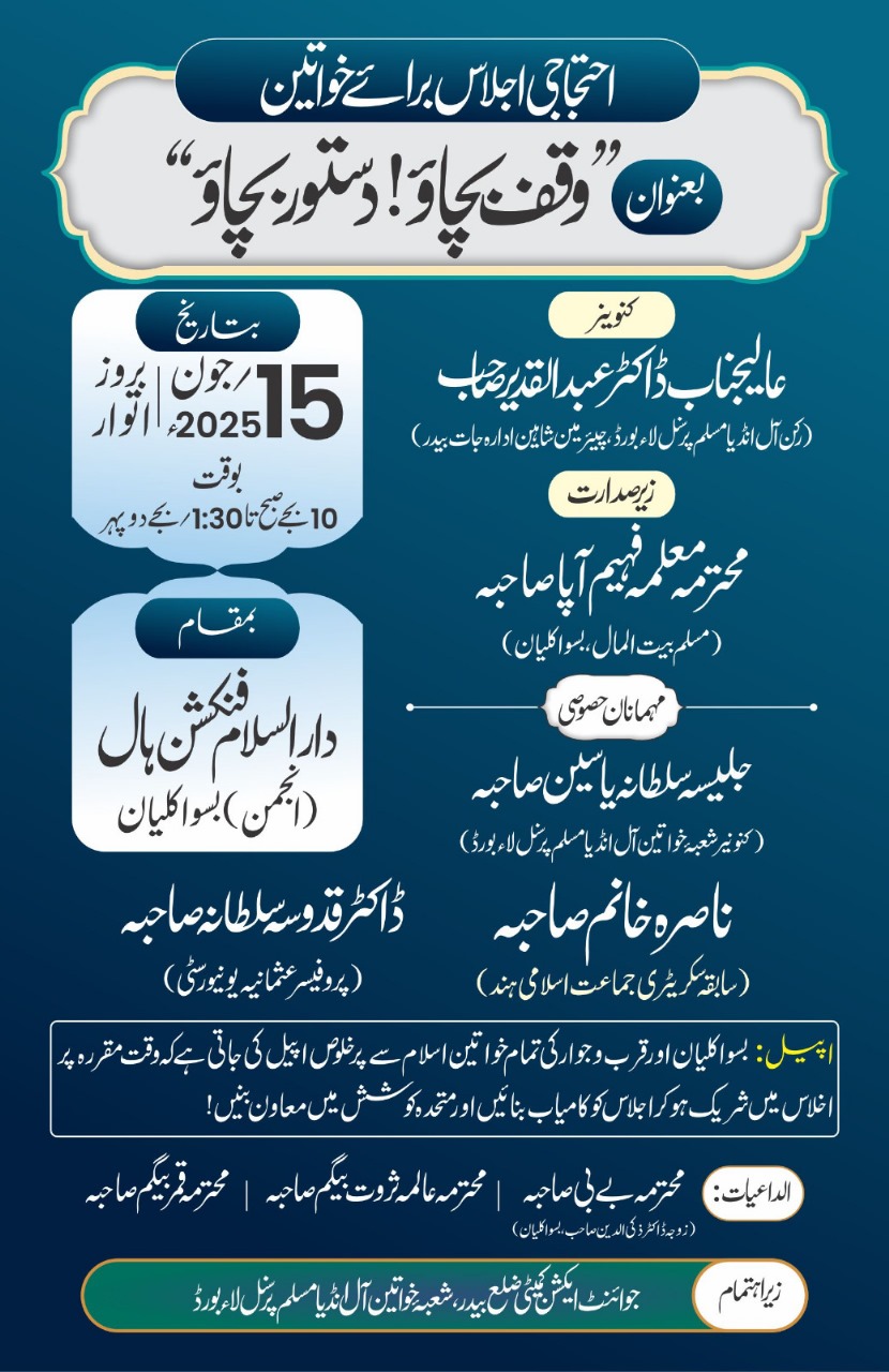 بسواکلیان:( نامہ نگار): ملک میں وقف املاک کے تحفظ کو لے کر بڑھتی ہوئی بے چینی اور وقف قوانین میں مجوزہ ترامیم کے پس منظر میں، بسواکلیان میں خواتین کا ایک اہم احتجاجی اجلاس 15 جون 2025 بروز اتوار، بوقت : صبح 10بجے تا 1.30بجے تک, دارالسلام فنکشن ہال, نعلبند گلّی بسوا کلیان میں منعقد ہوگا , جس میں مسلم خواتین کی کثیر تعداد کی شرکت متوقع ہے۔