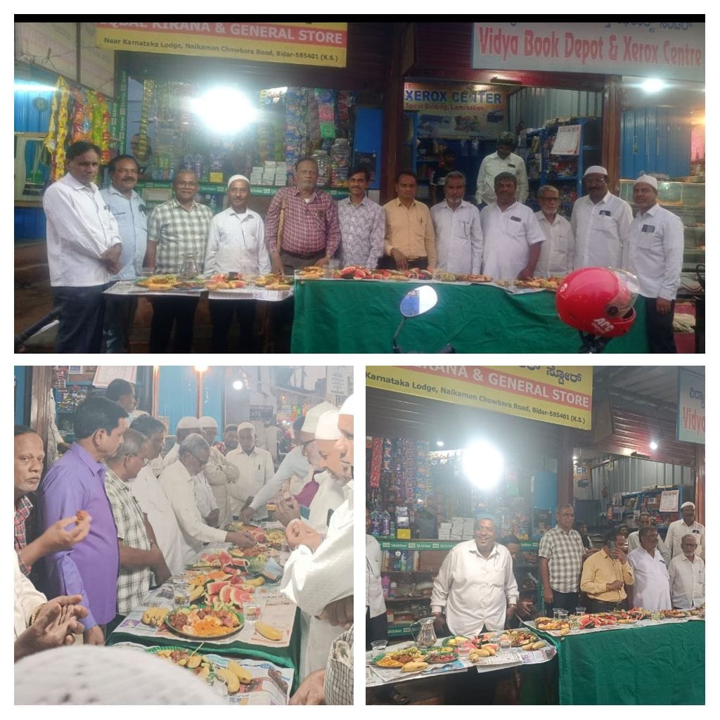 بیدر۔ 22؍فروری (محمدیوسف رحیم بیدری): بیدر شہر کے قدیم علاقہ نئی کمان میں واقع ودیا بک ڈپواینڈ زیرآکس سنٹر کے مالک جناب شیوراج کوڈّے نے آج مسلمان بھائیوں کواپنی دوکان پر افطار کرایا۔ جس میں خصوصاً نئی کمان ، راؤتعلیم ، چمکوری گلی ، آستانہ روڈ کے مسلمان روزہ داروں نے شرکت کی اور اپناروزہ افطار کرایا۔ اس موقع پرجناب عبدالکلیم صاحب صدر مدرس نے صحافیوں کوبتایاکہ جناب شیوراج کوڈّے نہایت ہی شریف دوکاندار ہیں۔ مسلم بھائی چارے کو بڑھانے کے لئے انھوں نے آج دعوتِ افطار رکھی تھی۔ ہرسال وہ اس طرح کااہتمام کیاکرتے ہیں۔ تمام مسلمان بھائیوں نے جناب شیوراج کوڈّے صاحب کی بڑی تعریف کی اور ان کے افطا رکرانے پر ان کاشکریہ بھی اداکیا۔